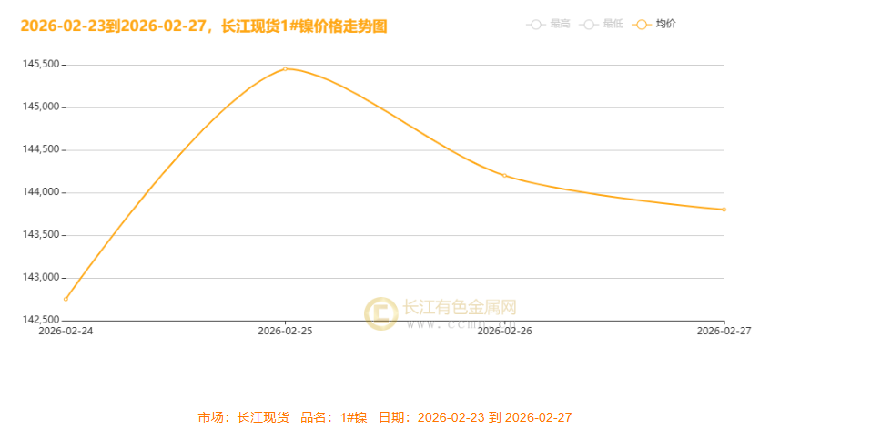 本周(2 月 24-27 日),长江现货 1# 镍价走出典型的 “先扬后抑” 行情,周初两日均价从 142,750 元 / 吨飙升至 145,450 元 / 吨,随后回落至 143,800 元 / 吨,整体重心上移但分歧加剧。本周1#镍总均价报144050元/吨,整体上涨937.5元,这一波动背后,是全球宏观面的多重信号交织作用。